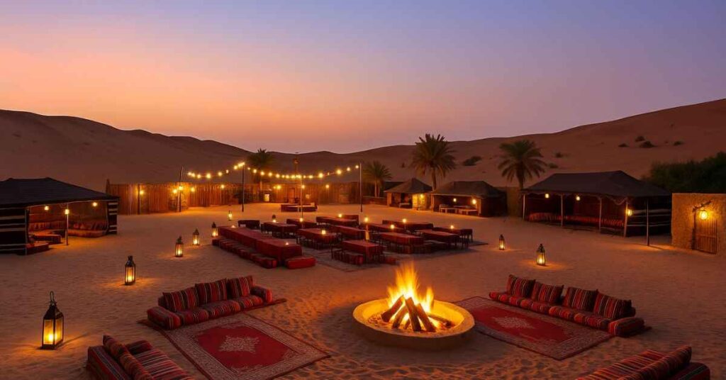 Enjoy Desert Adventures at Bedouin Oasis Camp. The camp is in the beautiful Ras Al Khaimah desert. It offers fun and exciting outdoor activities. Visitors can try camel riding, dune bashing, and sandboarding. They can also enjoy traditional Bedouin food and watch folk dances around the campfire. The camp shows the beauty of desert life and Arab culture.