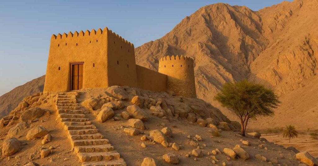 People can climb the hill to get to the top of Dhayah Fort. They can see pretty mountains, palm gardens, and villages below. The fort teaches young people about Emirati heritage and culture. It’s a great place for school trips and to learn about history.